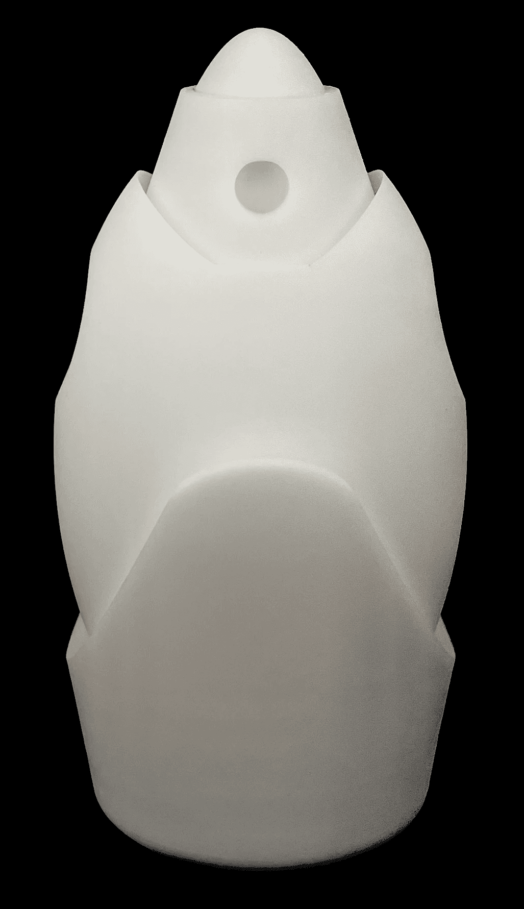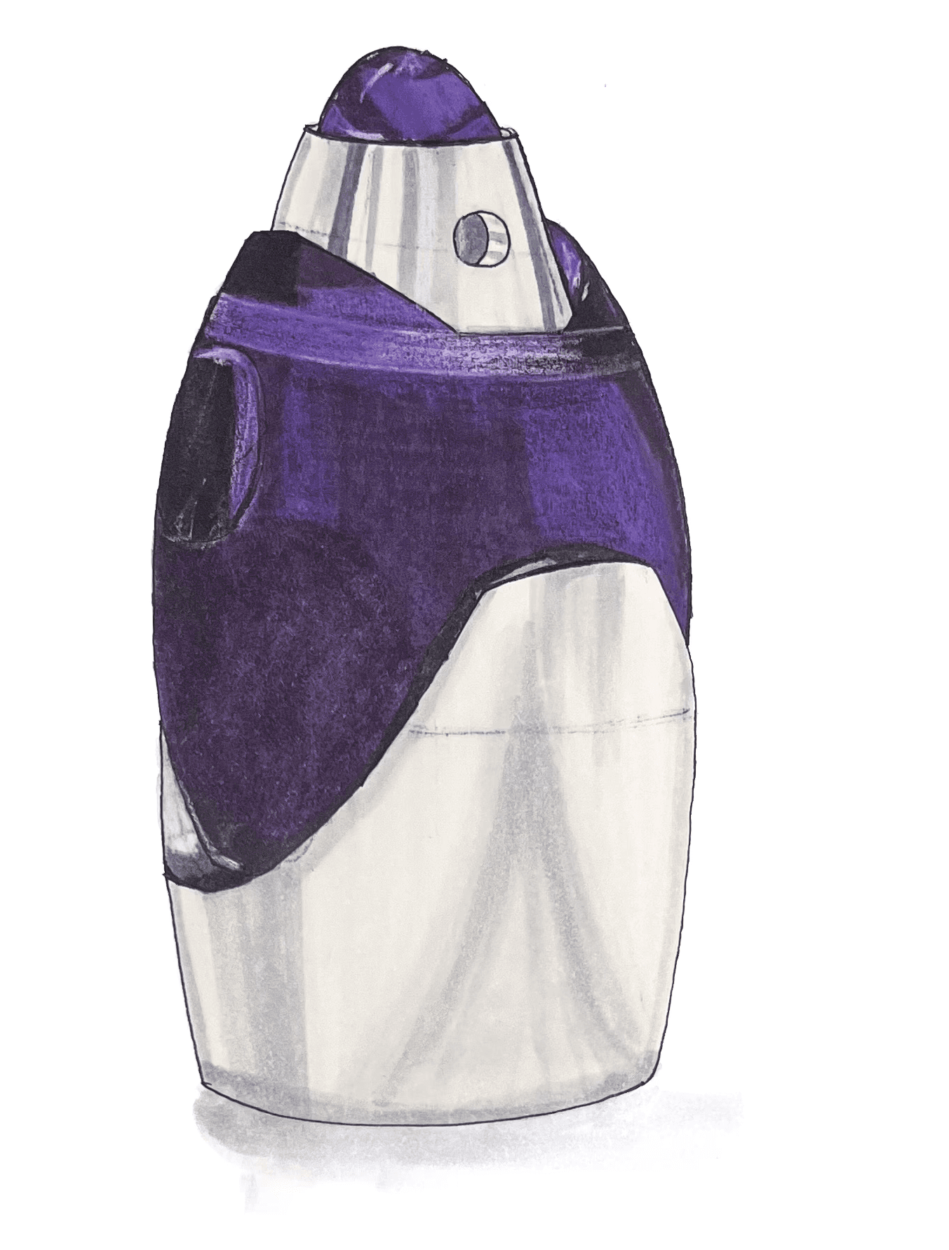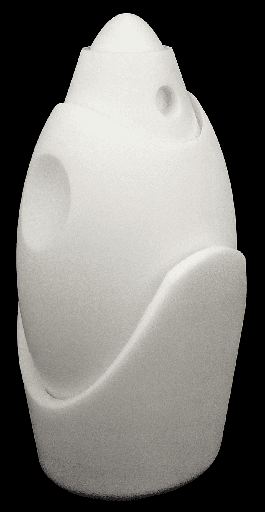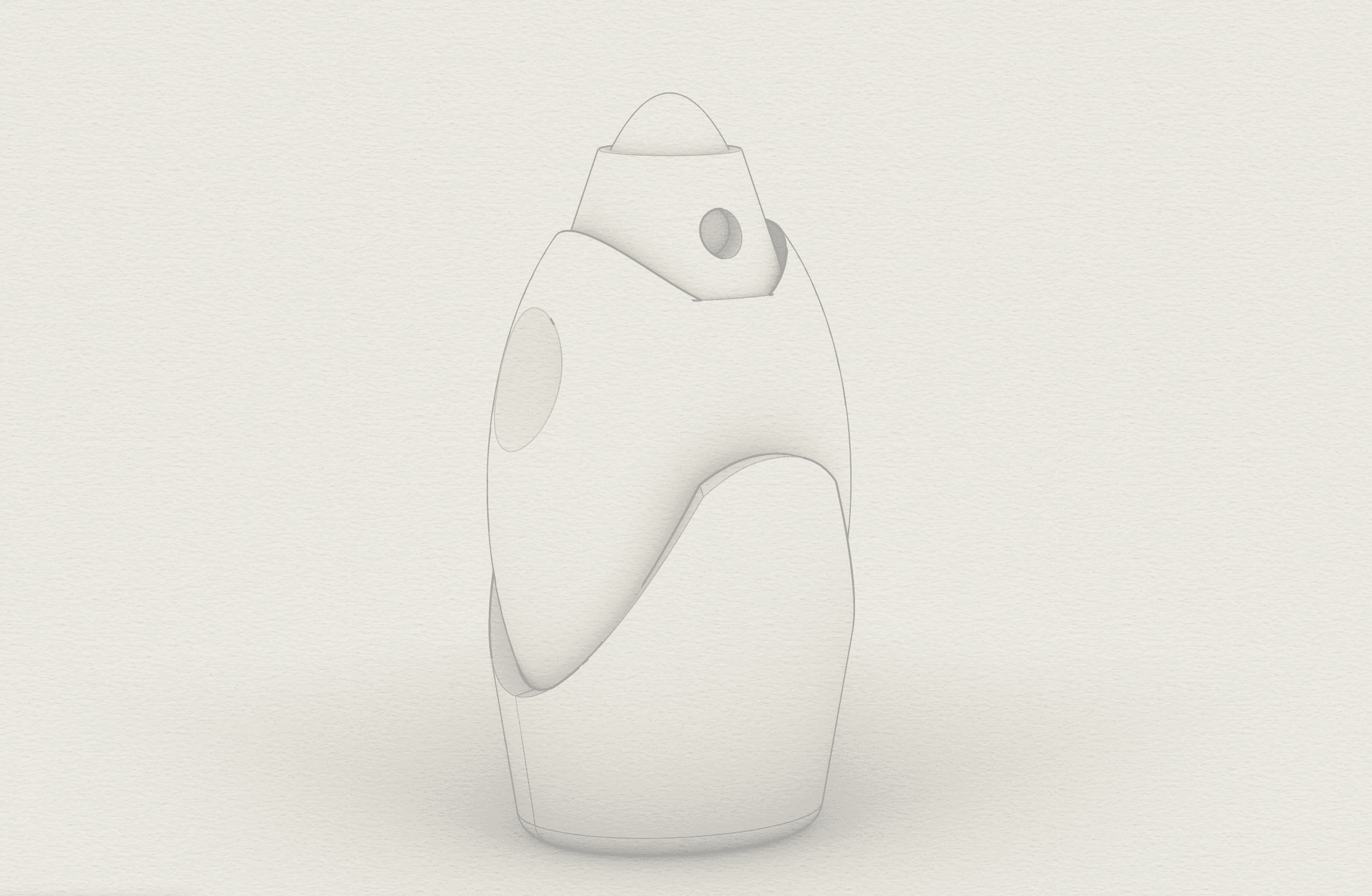 Through a simplified lens, the form integrates male and female anatomical references to appeal to a unisex audience while maintaining a futuristic aesthetic inspired by the silhouette of a rocket. Subtle divots along the sides of the bottle enhance ergonomics and improve grip, prioritizing user interaction alongside visual form. The use of white resin in the final print accentuates the object's sculptural quality while providing a smooth, tactile finish. Design development was guided by a focus on balancing user experience with visual impact.